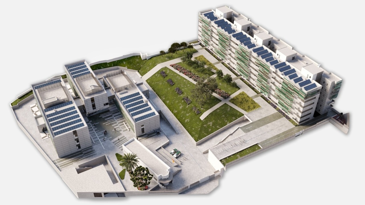 • Edificio de pabellones: ubicado en la plataforma superior, que acoge las viviendas del complejo en un bloque longitudinal con patios interiores, junto con las áreas destinadas a instalaciones y aparcamiento.