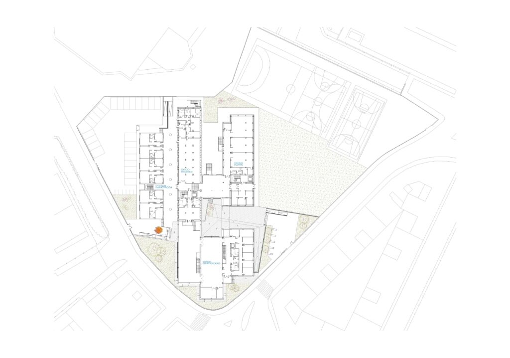 La intervención se articula a través de la rehabilitación del edificio existente, actualmente en desuso, y la incorporación de nuevos volúmenes en su entorno. El desarrollo del conjunto se organiza en cuatro fases independientes: